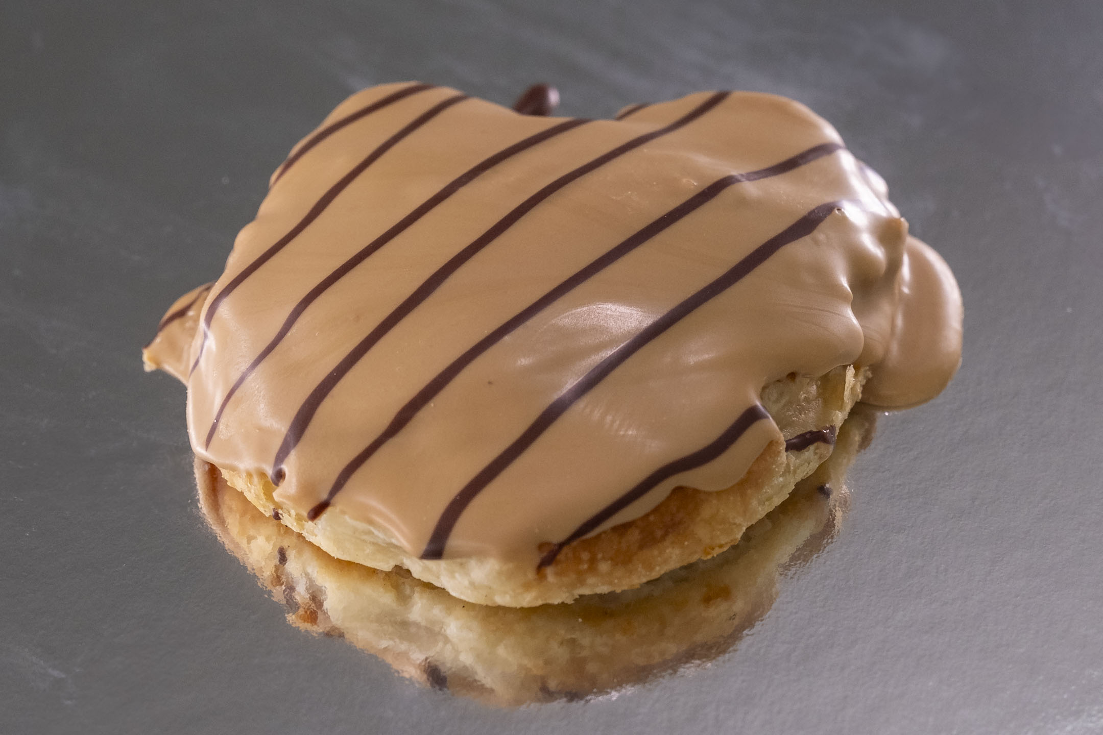 Disfruta de la combinación perfecta entre un hojaldre crujiente y un delicioso relleno cremoso de caramelo. Esta palmera está cubierta con una suave capa de caramelo y un toque de cacao, creando una experiencia dulce y envolvente en cada bocado. ¡El placer de lo crujiente y lo dulce, en una sola delicia!